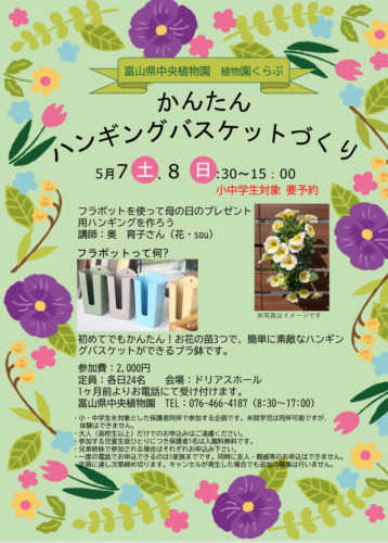 5月7日8日 富山県中央植物園にて小・中学生向けフラポット体験会です。