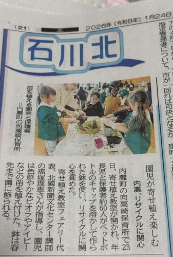 石川県の先生が年長さんとエコフラポットにお花を植えられました