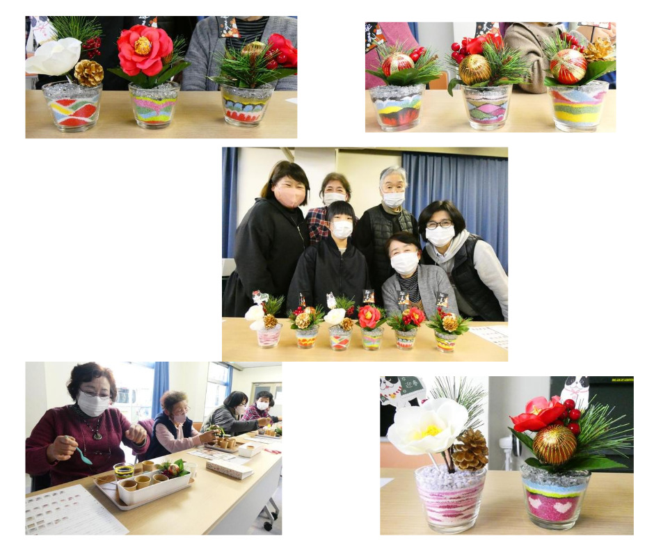 公民館でカラーサンド教室でした。 お正月飾りを皆さんで、ワイワイとつくりました。 どの作品も素敵です! お世話くださりありがとうございました。