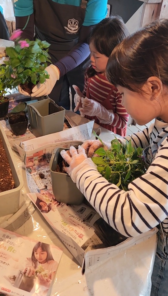 ペットボトルのキャプ100%で出来ている【エコフラポット】に子供たちとお花を植えました。 初めてのハンギング作り。 真剣で嬉しそうな顔を見ていると 花育活動の大切さを実感します